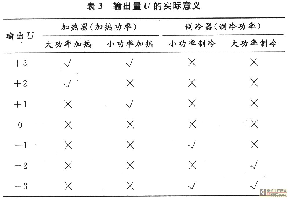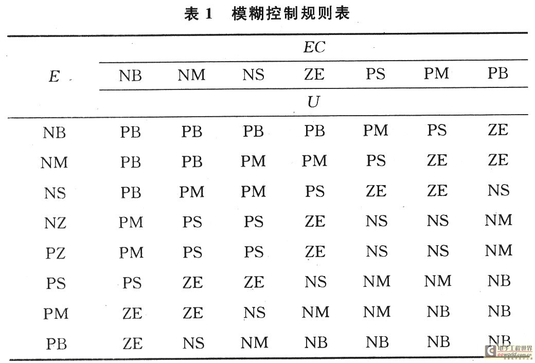根据控制系统的输入/输出特性,以消除温度偏差为控制目标,制订控制规则如表1所示。