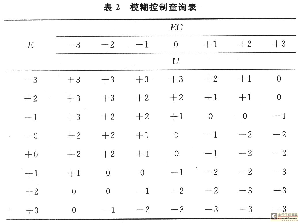 工作机理:依照模糊控制查询表建立的二维常数数组,将输入偏差E和偏差变化率EC量化到其基础变量论域,作为数组的行和列实时检索该查询表,得到实时输出U,依照输出量U的实际意义控制加热器或制冷器,从而驱使温度稳定在设定值。