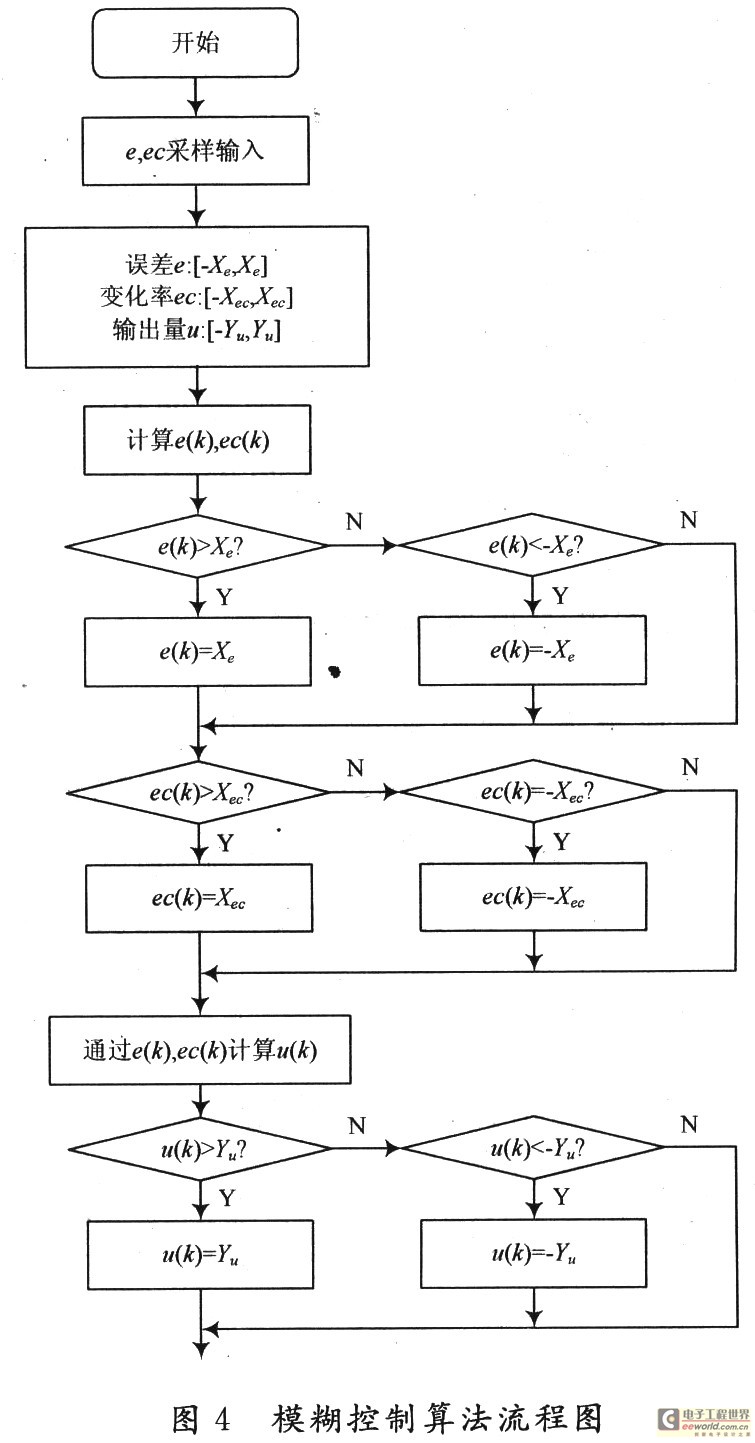 采用ST语言进行程序设计,包括主程序、模糊控制算法、中断服务程序、操作命令与报警程序,其中模糊控制算法程序流程图如图4所示。