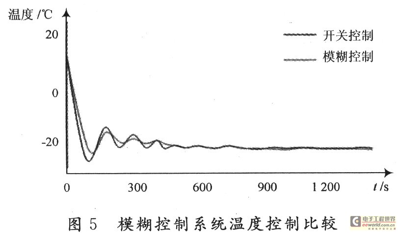 外部环境温度从16℃降温到-20℃,应用效果如图5所示,从开始到基本稳定(与设定值相差±1℃)用时510 s,系统稳定后波动范围在±O.8℃以内。收敛速度、系统稳定性与量化因子、比例因子有关,合理选择量化因子、比例因子,在收敛速度与稳定性之间取得平衡。