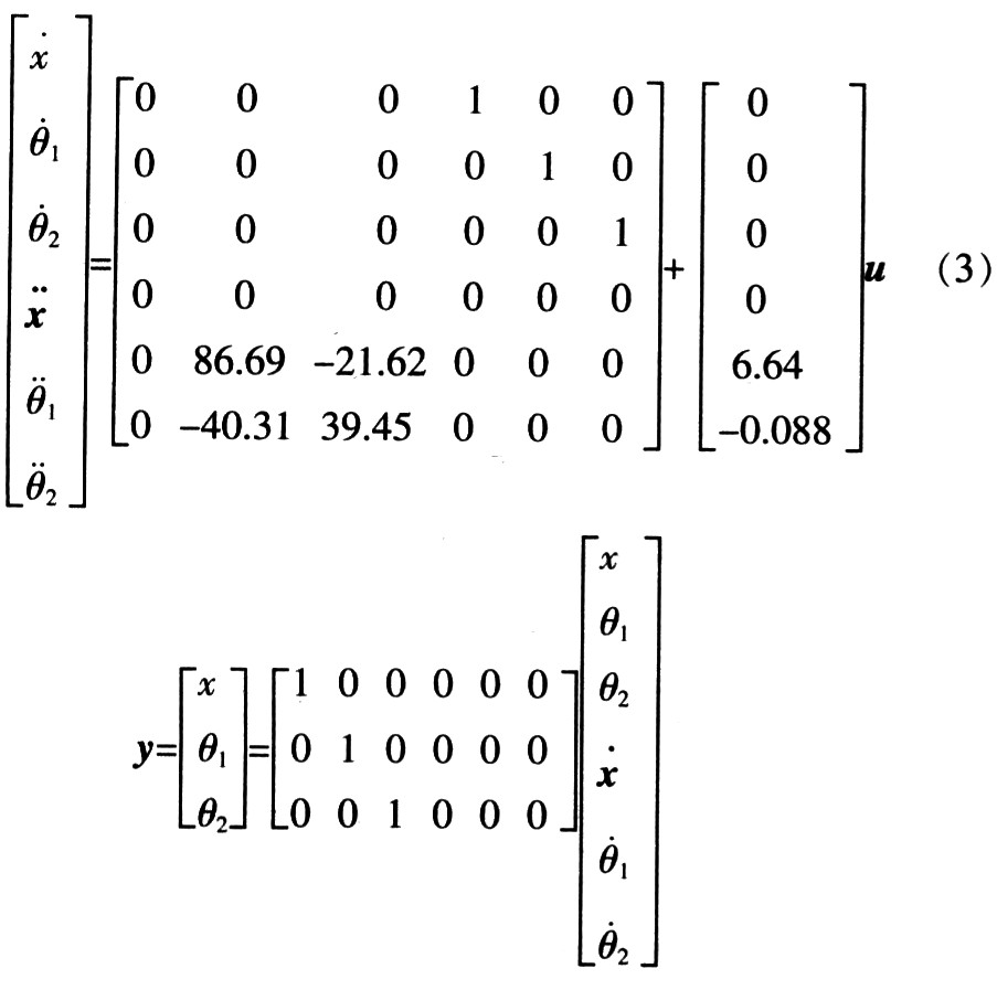 在二级倒立摆系统中,系统的广义坐标有3个,分别为x,θ1,θ2。经计算并线性化并带人参数值得到系统的状态空间方程: