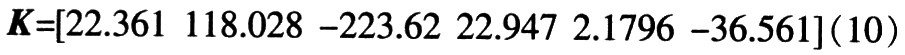 根据二级倒立摆的参数,基于MATLAB强大的矩阵运算及其丰富的内部函数,利用K=lqr(A,B,Q,R)命令计算,可得到状态反馈矩阵K: