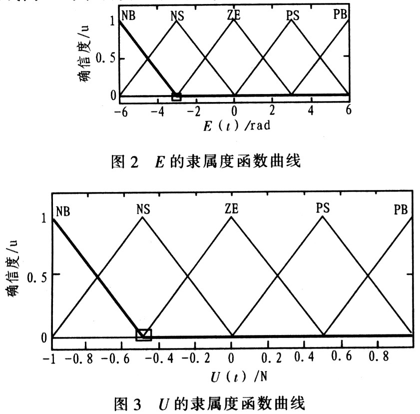本文是将最优控制理论与模糊控制相结合而采用的一种融合技术。它是把小车的位移、上摆摆角、下摆摆角综合成一个变量E,将小车的速度、上摆的角速度、下摆的角速度综合成一个变量EC,E和EC作为模糊控制器的输入,电压u作为输出,减少模糊控制器的输入,解决规则爆炸的问题,由此设计Mamdani型模糊控制器。
