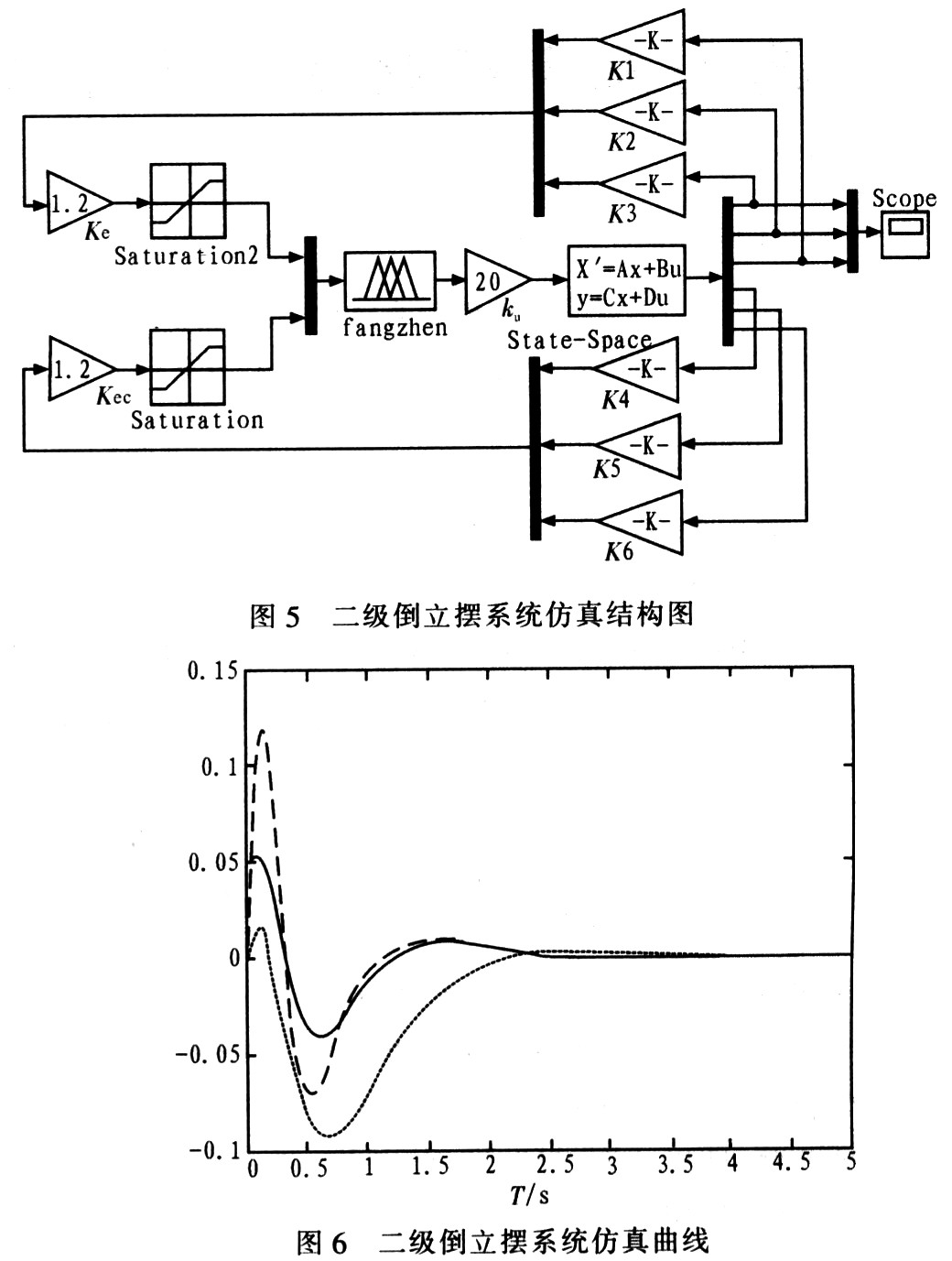 模糊控制器采用重心法实现非模糊化,与一般采用的最大隶属度法相比较,重心法具有更加平滑的输出推理控制。通过以上分析和试验,并恰当地选择模糊逻辑系统的参数,从而设计一个适合被控对象的模糊控制器,如图5所示。图5中,Ke、Kec为量化因子,Ku为比例因子,State-Space为系统的状态空间方程,Saturation为限幅模块,Scope为示波器模块。根据以上工作,在Simulink环境中对二级倒立摆系统进行仿真,其仿真曲线如图6所示。