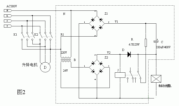 0V的交流电,一路经Z1整流在V1端产生220V脉动直流电,经C流过制动线圈L,由于C的电流特性是从大到小,在上电瞬间的大电流流过制动线圈L打开制动器,同时电机D得电工作;另一路经变压器B变压后输出24V交流电,经Z2整流后输出24V脉动直流电,经D流过L线圈,C充电结束后用这一较小电流继续维持L工作。由于制动线圈中流过的是直流电流,电磁铁的磁力线方向不变,所以吸合好,无噪声;当K1(或K2)断开时,电机失电,同时B失电,制动线圈L无电流流过,制动器动作,电机停转。为了使本制动系统能反复快速的多次启停,加入了放电回路J和R,电路工作时V1端24V直流电压使J吸合,J的常闭触点断开,放电回路不工作;电路停止工作时,J失电,C的电压经R和J的一组常闭触点放电,为制动器下一次启动作好准备。D为保护二极管,在电路启动时防止C的充电流流过J和击穿Z2。