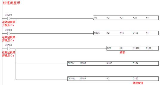 DFM数字频率输出,通过PLC的SPD指令采集变频器的工作频率,然后在程序里面转换成单位为“米/分钟”的数据从而达到在人机界面上面的显示: 程序部分如下: