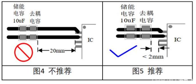 输入 VCC 及输出侧 VISO 的储能电容及耦合电容位置放尽可能摆放在靠近芯片的管脚位置, 以减少环路面积和 PCB 走线的寄生电感, 一般应控制在 2mm 以内。 储能电容 10μ F 应放在最外侧,去耦电容要放在靠近芯片的位置。 如下图 4 和图 5 所示。