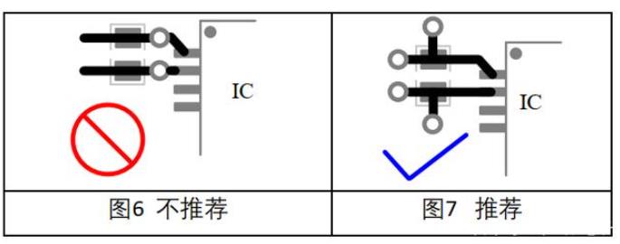 当需要在供电电源线和地线中放置过孔,过孔的摆放位置在电容相对于芯片管脚的外侧,而非放置在电容和芯片之间,以减少过孔寄生电感的影响,如下图 6 和图 7 所示。如果 PCB 空间允许应多放置几个过孔,这样过孔的寄生电感相当于并联,进一步减少过孔的寄生电感带来的影响。