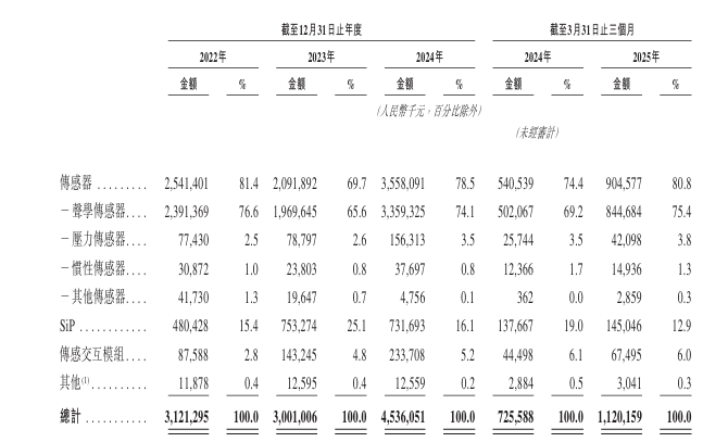 在商业化方面,从2022年到2025年3月31日止的三个月中,搭载自研芯片的传感器出货量分别为156.7百万颗、354.0百万颗、583.0百万颗、121.2百万颗及144.5百万颗,各期间总出货量的占比为9.9%、21.6%、30.3%、31.1%及31.1%。