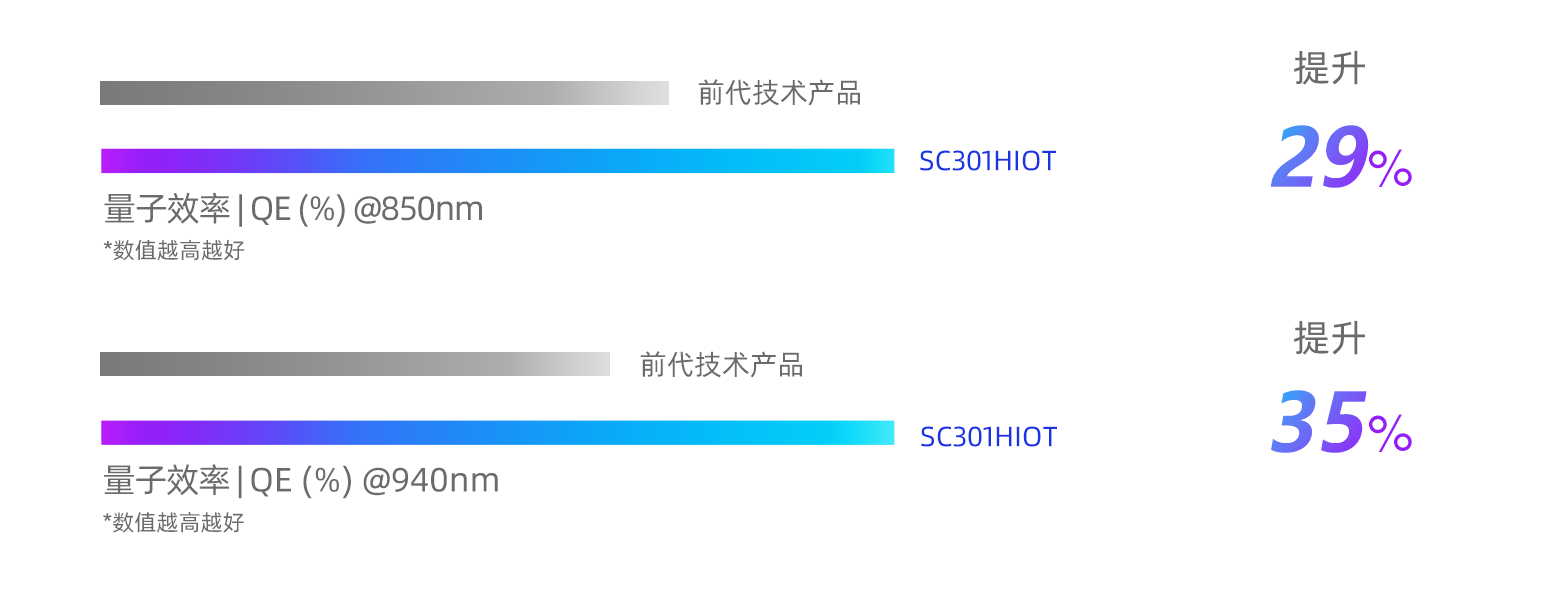 SC301HIOT基于思特威全新DSI™-2 Plus工艺技术打造, 通过优化硅片外延以及前道工艺,实现了近红外感度的大幅提升。与前代技术产品相比,SC301HIOT在850nm波段下峰值量子效率(peak QE)提升了约29% ,在940nm波段下峰值量子效率(peak QE)提升了约 35% ,在夜晚红外灯场景下,能为摄像头提供更清晰、明亮的影像。