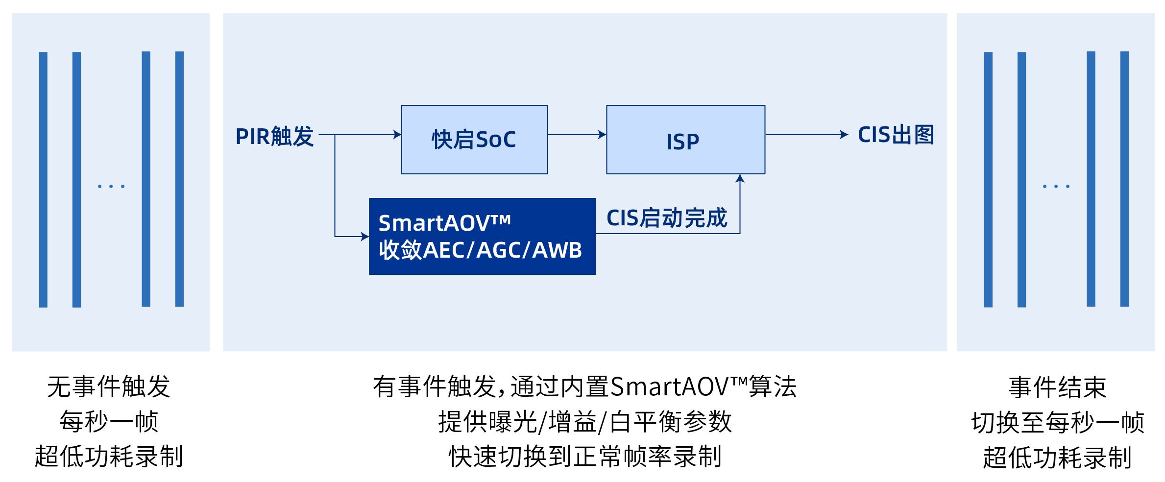SC301HIOT搭载了思特威独特的 SmartAOV™技术 ,支持 全时录像(AOV, Always-On Video) 功能。在遇到事件触发时,SC301HIOT能够从休眠状态中快速启动,并以30fps的常规帧率进行录制,以极低的启动耗时,确保从休眠到启动过程中的每一帧画面都清晰可见,不错过任何事件信息。在无事件触发时,SC301HIOT能以每秒1帧的超低帧率进行超低功耗持续录制 (整套方案工作功耗<40mW) ,从而实现 7*24小时全天候录像 。SC301HIOT出色的超低功耗全时录制功能,能进一步为摄像头系统整体功耗减负,保障智能门铃/门锁等无线电池供电摄像头设备和太阳能4G监控等无电无网设备实现节电工作。