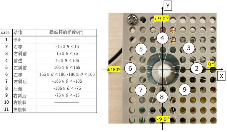 四. 根据计算出的角度 θ,MCU 通过无线通信将移动控制信号传输至机器人本体。五. 停止、左转、右转功能通过机械按钮实现,优先级最高,可覆盖其他状态。