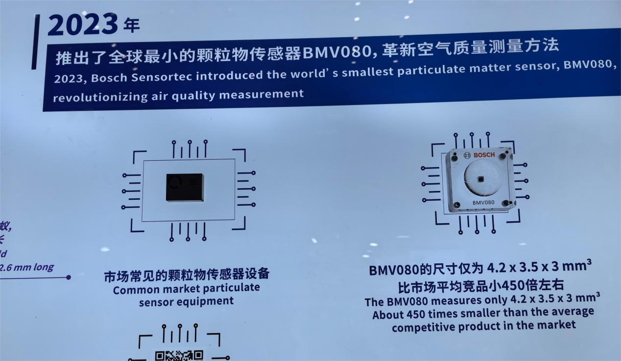 Bosch Sensortec在小型化的技术探索上不只是BMA530和BMA580,还推出了世界上最小的颗粒物(PM2.5)传感器 BMV080,尺寸仅为4.2x3.5x3mm³,在准确测量PM2.5浓度时,体积还比同类产品小了450倍,面向超小型物联网设备。