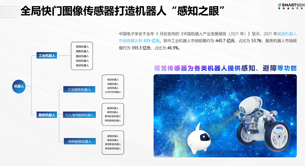 全局快门图像传感器在手机以外的另一个市场就是现在市场火热的机器人市场,为机器人打造“感知之眼”,为机器人提供各类的感知、避障等功能。