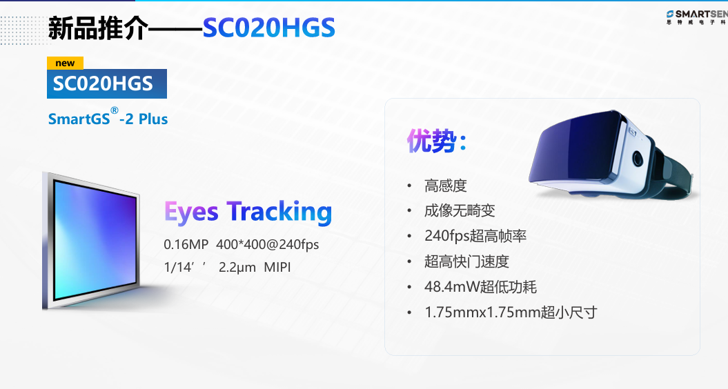 另外一款是小尺寸低功耗的SC020HGS,可以用于可穿戴VR上 400*400分辨率,封装1.75mm*1.75mm极小尺寸,低功耗应用如眼球追踪(Eye Tracking)。