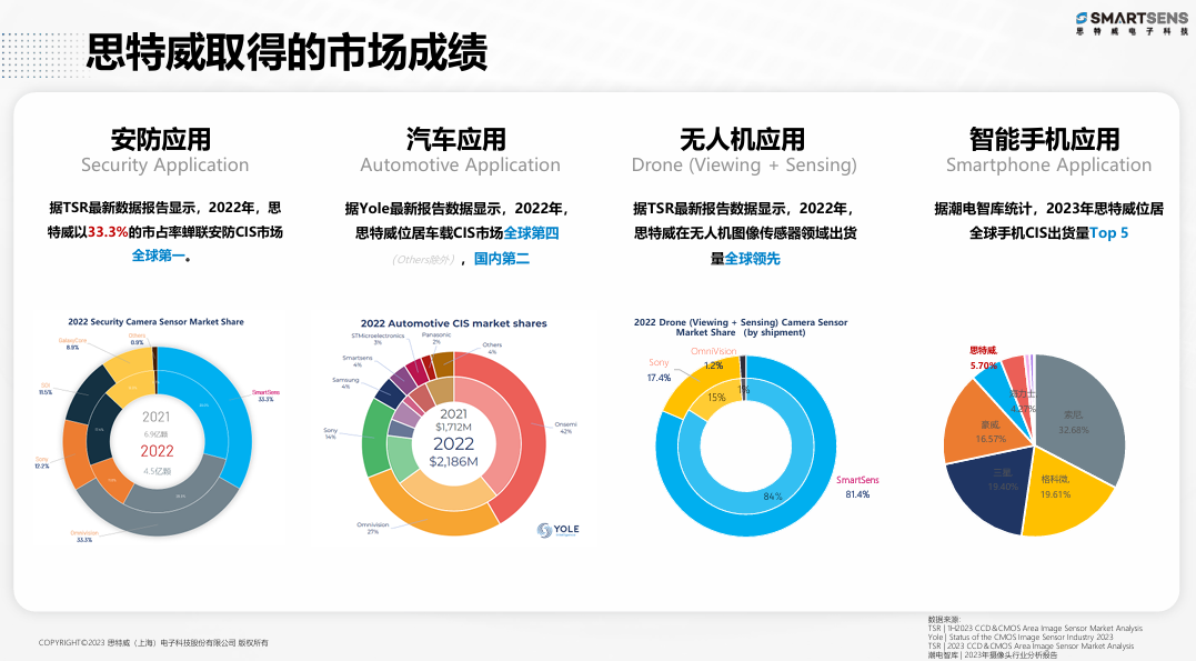 最后宗翔再介绍了一下思特威的产品在市场取得的成绩。在安防市场33.3%的市场占有率排名第一,车载市场全球第四国内第二,无人机市场遥遥领先排名第一,智能手机市场也进入到了全球Top 5。