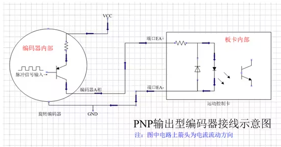 PNP输出型编码器的接线方式是将编码器的A端和板卡的EA+端口相连,然后COM端与板卡EA-端口相连并接至电源负极。同时,编码器的VDC端应接电源正极。
