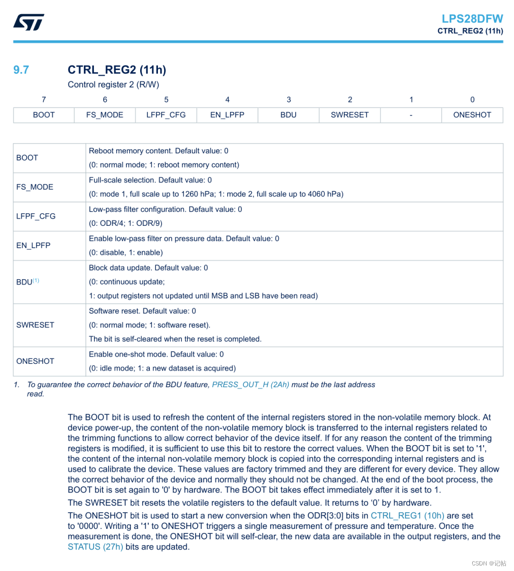 对于 LPS28DFW 气压传感器,CTRL_REG1(10h)和 CTRL_REG2(11h)的主要设置如下: