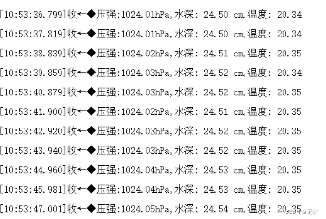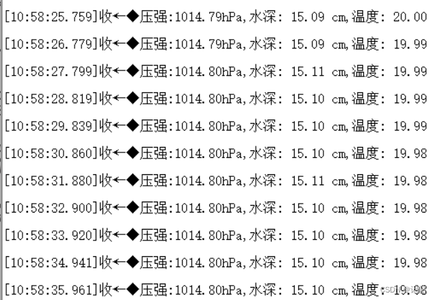 printf("压强:%6.2fhPa,水深:%6.2f cm,温度:%6.2frn",data.pressure.hpa,h*100*100,data.heat.deg_c);