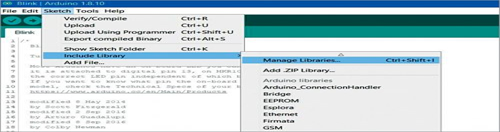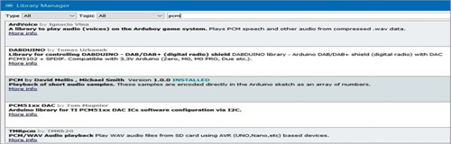 通过从Sketch→Include library→Manage Libraries选项下载库来在Arduino IDE中安装所需的库,如图4所示。从Library Manager中搜索PCM库(请参阅图5)并进行安装。同样,请按照上述步骤安装PIR传感器库。
