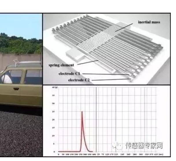 汽车碰撞后,传感器的proof mass产生相对位移,信号处理单元采集该位移产生的电信号,触发气囊。