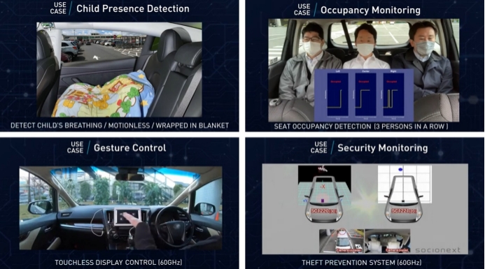 基于上述功能特性,Socionext SC1260系列毫米波雷达传感器可帮助车制造商实现儿童存在检测(CPD)、入座情况检测(SOD)、车内入侵检测以及手势操作等功能,保障驾乘安全,增强座舱黑科技体验感。