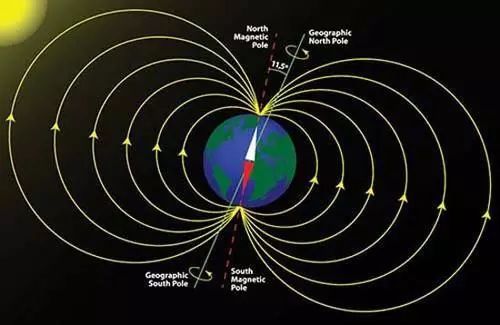 如图所示,地球的磁场象一个条形磁体一样由磁南极指向磁北极。在磁极点处磁场和当地的水平面垂直,在赤道磁场和当地的水平面平行,所以在北半球磁场方向倾斜指向地面。用来衡量磁感应强度大小的单位是Tesla或者Gauss(1Tesla=10000Gauss)。随着地理位置的不同,通常地磁场的强度是0.4-0.6 Gauss。需要注意的是,磁北极和地理上的北极并不重合,通常他们之间有11度左右的夹角。