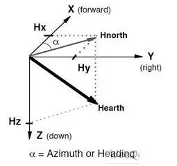 实际上对水平方向的两个分量来说,他们的矢量和总是指向磁北的。罗盘中的航向角(Azimuth)就是当前方向和磁北的夹角。由于罗盘保持水平,只需要用磁力计水平方向两轴(通常为X轴和Y轴)的检测数据就可以计算出航向角。当罗盘水平旋转的时候,航向角在0—360度之间变化。