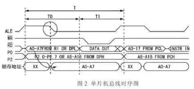 为了节约芯片引脚,采用P0口复用方式,除了作为数据总线外,在ALE信号时序匹配下,通过外置的数据锁存器,在总线访问前半周期从P0口送出低8位地址,后半周期从P0 口送出8位数据。