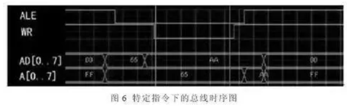 从图6中可以看出,P0口先送55H,在ALE下降沿实现地址锁存,随后送出数据0AAH,在WR有效(低电平)期间锁存器输出低8位地址55H,P0口送出数据0AAH。