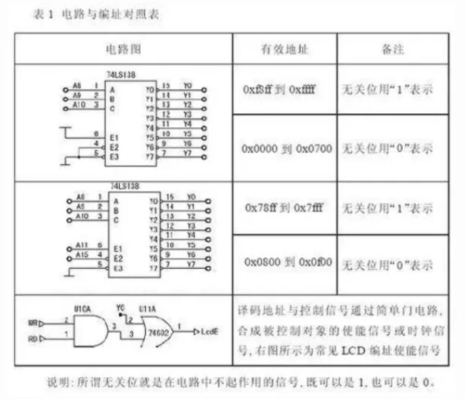 理论上高8位地址线可以产生256个有效地址,如何实现地址“扩展”呢? 地址扩展准确描述是地址译码,例如3根地址线可以译码成8个地址,4根译码成16个有效地址。这里选择3-8译码器实现地址译码,电路图以及对应的编址如表1所示。