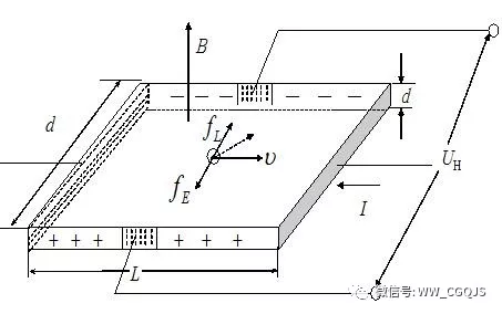 如图在与磁场垂直的半导体薄片上通电流I,假设载流子为电子(N型半导体材料),它沿与电流I相反的方向运动。由于洛仑兹力fL的作用,电子将向一侧偏转(如虚线箭头方向),并使改侧形成电子积累。而另一侧形成正电荷积累,元件的横向形成电场。该电场阻止电子继续向侧面偏移,当电子所受到的电场力fE与洛仑兹力fL相等时,电子积累达到动态平衡。这时,在两端横面之间建立的电场称为霍尔电场EH,相应的电势称为霍尔电势UH。