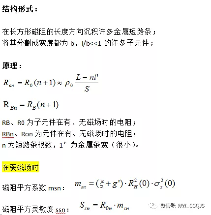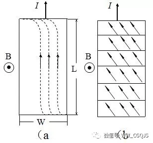 图(a)是没有栅格的情况,电流只在电极附近偏转,电阻增加很小。在L>W长方形磁阻材料上面制作许多平行等间距的金属条(即短路栅格),以短路霍耳电势,这种栅格磁阻器件如图2.2.1(b)所示,就相当于许多扁条状磁阻串联。所以栅格磁阻器件既增加了零磁场电阻值、又提高了磁阻器件的灵敏度。常用的磁阻元件有半导体磁阻元件和强磁磁阻元件。其内部有制作成半桥或全桥等多种形式。