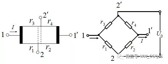 制作霍尔元件时,不可能保证将霍尔电极焊在同一等位面上,如图,当控制电流I流过元件时,即使磁感应强度等于零,在霍尔电势极上仍有电势存在,该电势称为不等位电势U0。不等位电势是产生零位误差的主要原因。其等效电路如图所示,若两个霍尔电极在同一等位面上,则r1=r2=r3=r4,电桥平衡,U0=0。当霍尔电极不在同一等位面上时(如图2.1.3),因r3增大、r4减小,电桥平衡被破坏,使U0≠0。有各种方法可以减小不等位电势以达到补偿的目的。