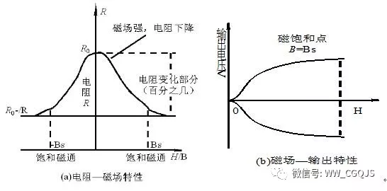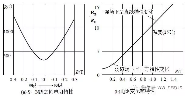 磁阻元件的电阻值与磁场的极性无关,它只随磁场强度的增加而增加如图(a)。在0.1T以下的弱磁场中,曲线呈现平方特性,而超过0.1T后呈现线性变化如图(b)。
