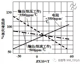图中分别给出了采用恒流、恒压供电方式时的温度特性。采用恒流供电时,可以获得–500ppm/℃的良好温度特性,而采用恒压供电时却高达3500ppm/℃。但是由于强磁磁阻元件为开关方式工作,因此常用恒压方式。