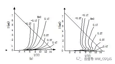 Ge磁敏二极管的伏安特性曲线,输出电压一定,磁场正向时随磁场增大电流减小;磁场负向时随磁场负方向增加电流增加;同一磁场下电压越大,输出电流变化量也越大。