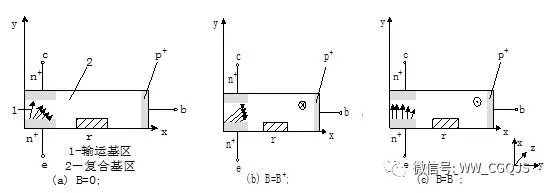 图(a):B=0时,由于基区宽度大于载流子的有效扩散长度,发射区注入的载流子少数输入c、大部分通过e-p-b形成Ib,Ib>Ic,电流放大倍数β<1。