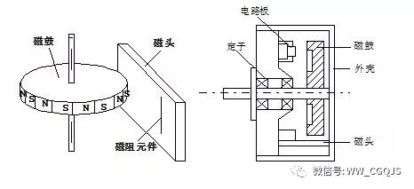磁性旋转编码器包含磁鼓和磁阻传感器头。