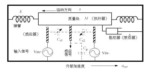 当加速度计连同外界物体(该物体的加速度就是待测的加速度)一起加速运动时,质量块就受到惯性力的作用向相反的方向运动。质量块发生的位移受到弹簧和阻尼器的限制。显然该位移与外界加速度具有一一对应的关系:外界加速度固定时,质量块具有确定的位移;外界加速度变化时(只要变化不是很快),质量块的位移也发生相应的变化。另一方面,当质量块的发生位移时,可动臂和固定臂(即感应器)之间的电容就会发生相应的变化;如果测得感应器输出电压的变化,就等同于测得了执行器(质量块)的位移。既然执行器的位移与待测加速度具有确定的一一对应关系,那么输出电压与外界加速度也就有了确定的关系,即通过输出电压就能测得外界加速度。