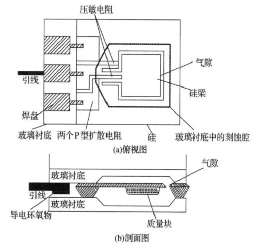 压阻式加速度传感器通常采用压敏电阻作为敏感元件。压敏电阻的电阻率变化与质量块的位移有关。其工作原理是将被测加速度转换为硅材料的电阻率变化来进行加速度的测量。首次报道的微加速度传感器为压阻式,其示意图如图所示。最先商业化的微加速度传感器也为压阻式。