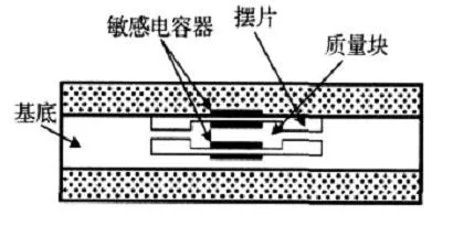 电容式加速度传感器的敏感元件为固定电极和可动电极之间的电容器,是目前研究最多的一类加速度传感器,一般采用悬臂梁、固支梁或挠性轴结构,支撑一个当作电容动板电极的质量块,质量块与一个固定极板构成一个平板电容。其工作原理是在外部加速度作用下,校验质量块产生位移,这样就会改变质量块和电极之间的电容,将这种变化量用外围电路检测出来就可测量加速度的大小。一种电容式微加速度传感器的示意图如图所示。