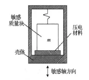 压电式加速度传感器的敏感元件是压电材料,压电材料直接将作用于质量块的力转换为电信号。压电式微加速度传感器的工作原理如图3所示。加速度传感器的质量块与压电材料相连,当输入加速度时,加速度通过质量块形成的惯性力加在压电材料上,使压电材料产生变形,压电材料产生的变形和由此产生的电荷(电压)与加速度成正比,输出电量经放大后就可检测出加速度大小。