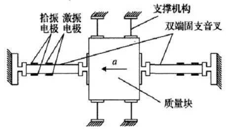 谐振式微加速度传感器的工作原理是利用加速度使谐振频率发生变化,从而测量出加速度。当传感器的平行梁形状改变时,刚度也会改变,两对谐振器分别感应惯性力,这会在谐振频率的变化上显示出来,使二者频率改变,比较这两个频率就可以测量出加速度的大小。谐振式微加速度传感器的独特优点是可以直接输出数字,测量精度极高,是一种很有前途和应用价值的微加速度传感器,但是制作工艺复杂。谐振式微加速度传感器能够满足某些领域如汽车行业对加速度传感器的高性能要求。其结构简图如图所示。