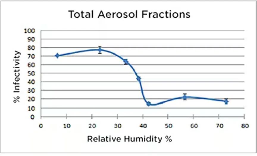 湿度的测量和控制在公共卫生中发挥着更广泛的作用。研究人员发现,湿度水平不需要达到极端的干燥或潮湿,就能对人体生理发生作用。正常情况下,鼻腔中的水分有助于排出气溶胶化病毒(悬浮在微滴中的病毒)。当鼻腔干燥时,气溶胶病原体可以更深入地渗透到呼吸系统,更容易引起感染 [1]。由于这些因素和其他生理因素的影响,当湿度低于 40% RH 时,气溶胶化流感病毒的感染力明显提高(图 1)[2]。近的研究表明,相对湿度在 40%~60% 之间对降低新冠肺炎感染也有一定作用,甚至可以降解引起新冠肺炎的 SARS-CoV-2 病毒 [3]。