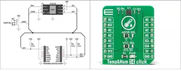 图 3:除了作为定制开发的参考设计原理图(左)外,MikroElektronika Temp & Hum 14 Click 板(右)还为基于 HTU31D 传感器的测量解决方案的即时评估和快速原型设计提供了一个平台。(图片:MikroElektronika)