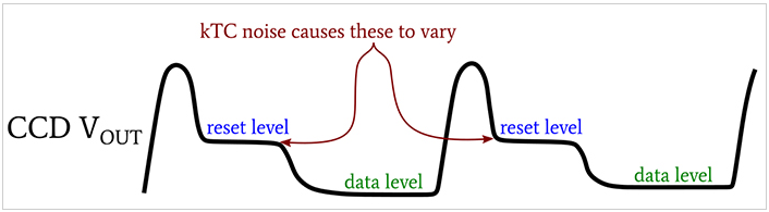 不久前,我们在涵盖相关双采样的文章中谈到了这个话题,但我称其为“kTC 噪声”而不是“重置噪声”。前一个术语指的是这种噪声的:它受 CCD 输出电路中的温度和电容的影响。后一个术语指的是效果,因为 kTC 噪声会导致 CCD 信号复位电平中像素到像素的变化。