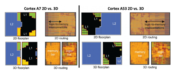该方法的结果讨论了一个Arm Cortex A7设计,包含L1, L2高速缓存和逻辑层。所有的L2和部分L1缓存被放置在内存层,其余的设计在逻辑层实现。因此,缓存和逻辑之间的互连缩短了很多。类似的过程也应用于Cortex A53的设计上。