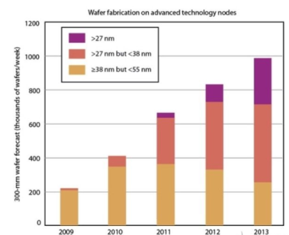 为了按比例缩小半导体IC,需要在300mm的晶圆上生成更精细的线条。据市场研究机构VLSI Research预测,虽然目前大多数量产的IC是基于55nm或55nm以下的设计节点,但这些设计规则将缩小至38nm或更小,到2013年甚至会缩小到27nm。