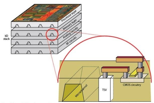 未来的3D堆栈可能包含处理器、存储器、逻辑和模拟及RF电路,所有这些都通过TVS互连。流体通过MEMS微通道实现冷却。